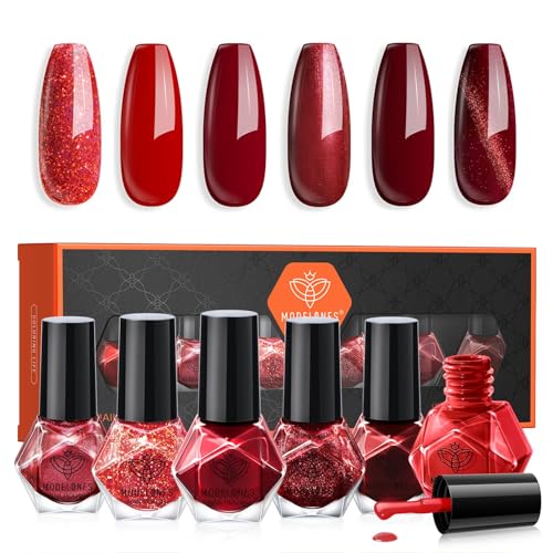 MODELONES Nagellack, 6 st, nagellack, snabbtorkande, röd, glitter, 6 färger, nagellack, giftfri, vattenbaserad, långvarig gel, polering för gör-det-själv-salong, gåva för kvinnor flickor