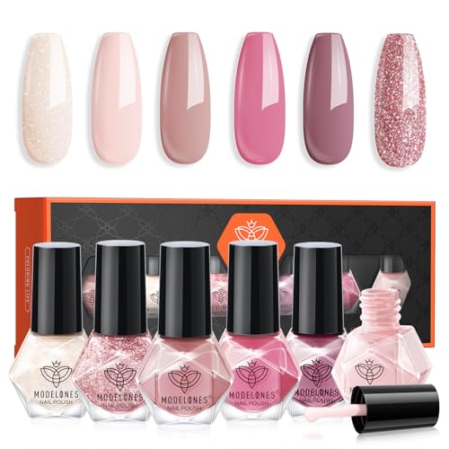 MODELONES Nagellack 6 st, nagellack snabbtorkande röd naken glitter 6 färger, nagellack giftfritt vattenbaserat, långvarigt nagellack för gör-det-själv-salong, gåva för kvinnor flickor manikyrsalong