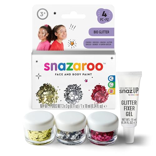 Snazaroo 1172244 Ekologiskt glitter grovt i ett set, 3 färger: guld, silver, rött, 10 ml fixeringsgel, skonsamt mot huden, lätt att ta bort, miljövänligt