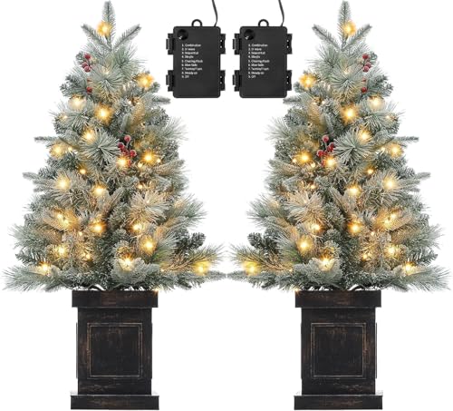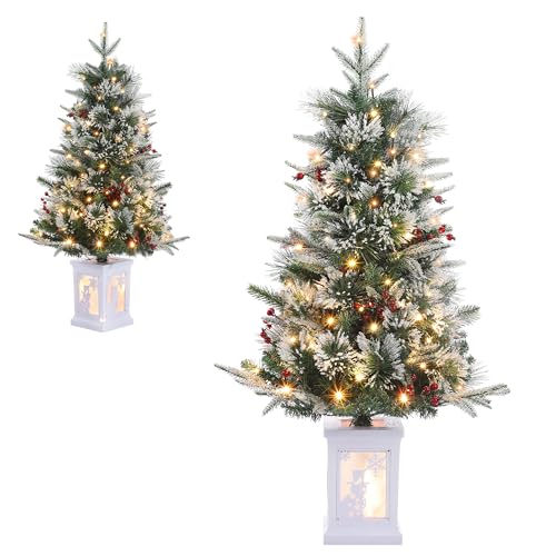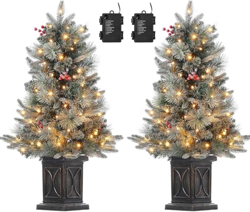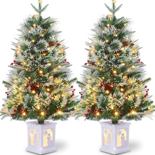 Garvee Konstgjord julgran 90 cm set med 2, 78 LED-lampor, realistiska grenar, röda bär, snöflinga, konstträd för juldekoration (ramkruka)