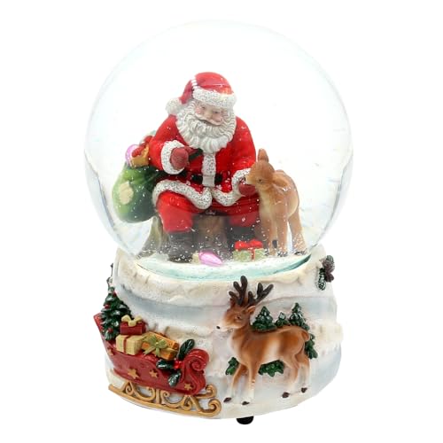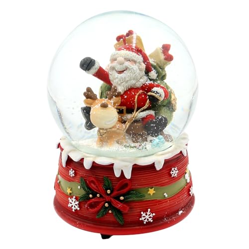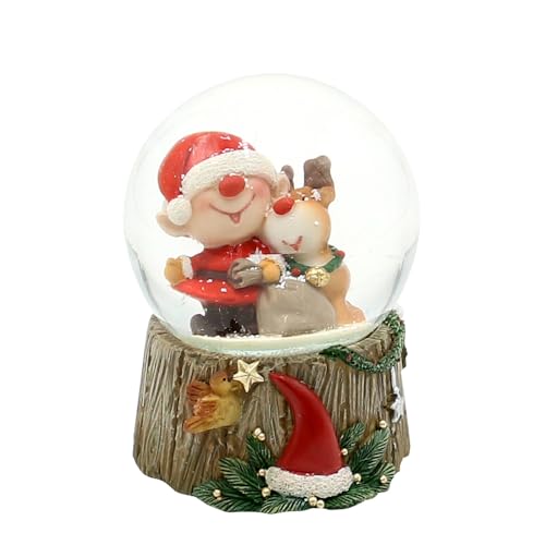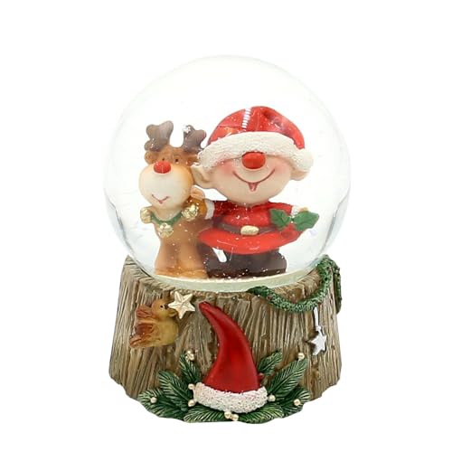 Dekohjälten24 snökula glad jultomte med ren på julbas, med lekmekanism, melodi: Rudolph The red-Nosed Reindeer, L/B/H/Ø kula 10 x 10 x 15 cm Ø 10 cm.