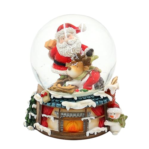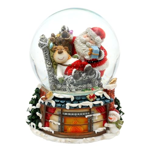 Snökula ren i fåtöljen och jultomten, på öppen spis, med lekdosa, melodi: Here Comes Santa Claus, L/B/H/Ø kula 11 x 11 x 15 cm Ø 10 cm.