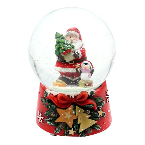Snökula jultomten med pingvin på julbas med lekverk, Melodie Feliz Navidad, L/B/H/Ø kula 10 x 10 x 15 cm Ø 10 cm.