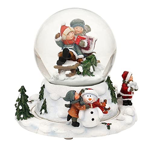 Dekohjälte24 snökula snögubbe med barn på omsorgsfullt dekorerad bas, med lekmekanism, melodi: Vit jul, mått L/B/H: 12,5 x 12 x 14,5 cm, kula Ø 10 cm
