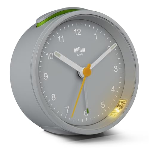 Braun Classic Analogue Alarm Clock with Snooze and Light, Quiet Quartz Movement, Crescendo Beep Alarm in Grey, model BC12G.