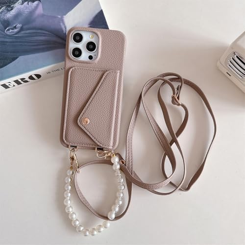 FIFTHAVE Mobiltelefonkedja iPhone 16 Plus fodral med kortfack, halsband mobiltelefonfodral iPhone 16 Plus fodral med band pärlor armband skyddande läderskal för upphängning snöre halsband skydd ljus