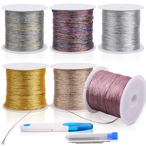 Fizdoqg 6 rullar metallic snöre 300 m guldtråd, gyllene snöre tunt glittergarn silvertråd för pyssel för gör-det-själv hantverk armband gör smycken halsband, 0,4 mm x 50 m/rulle