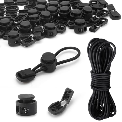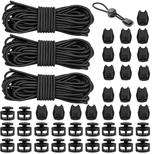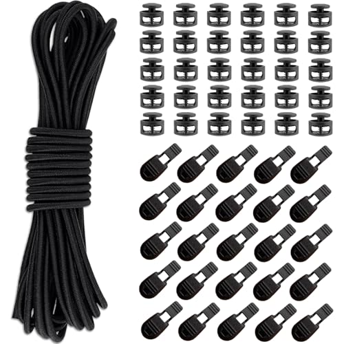 PXBSNB Elastiskt gummisnöre 3 mm x 20 m, runt gummirep med 30 sladdklämmor och 30 snörstopp 2 hål, svart gummisnöre 3 mm, gummirep för dragsko, ryggsäck, skosnören fjäderspänne