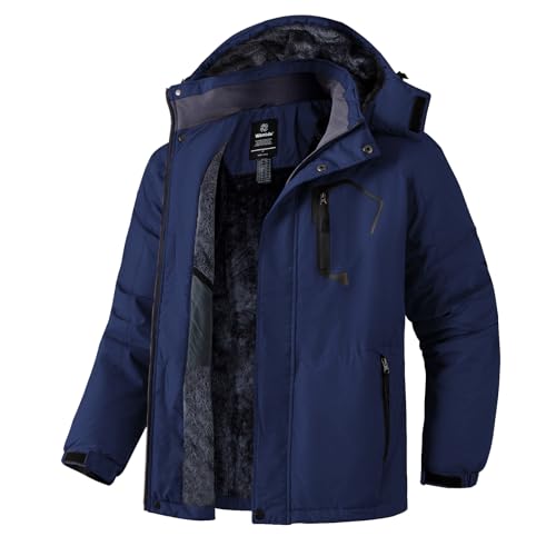 Wantdo Bergsskidjacka för män vattentät vinterrock med huva vindjacka varm snowboard jacka vindtät utomhusjacka, Marinblått Xsp, XL