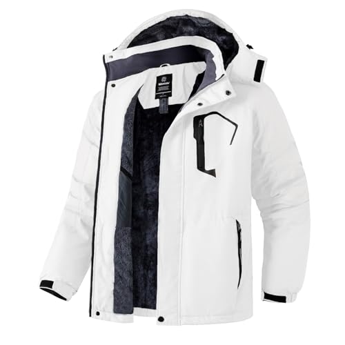 Wantdo Bergsskidjacka för män vattentät vinterrock med huva vindjacka varm snowboard jacka vindtät utomhusjacka, Vitt, L