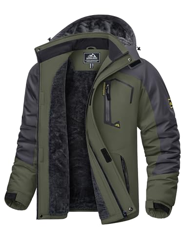 KEFITEVD Skidjacka för män andas varm fodrad vinterjacka med avtagbar huva snowboardjacka vattentät utomhusjacka, Mörk oliv, 3XL