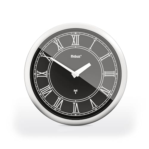 Mebus trådlös väggklocka, 26 cm, ljudlös, romerska siffror, silverram, svart urtavla, modell 19814 – snygg och tyst