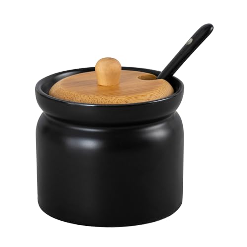 GALICJA RONNIE sockerskål keramik med sked och lock – sockerskål svart – stabil rymlig sockerskål av keramik med lock och sked – kökstillbehör – 8,5 x 8 cm
