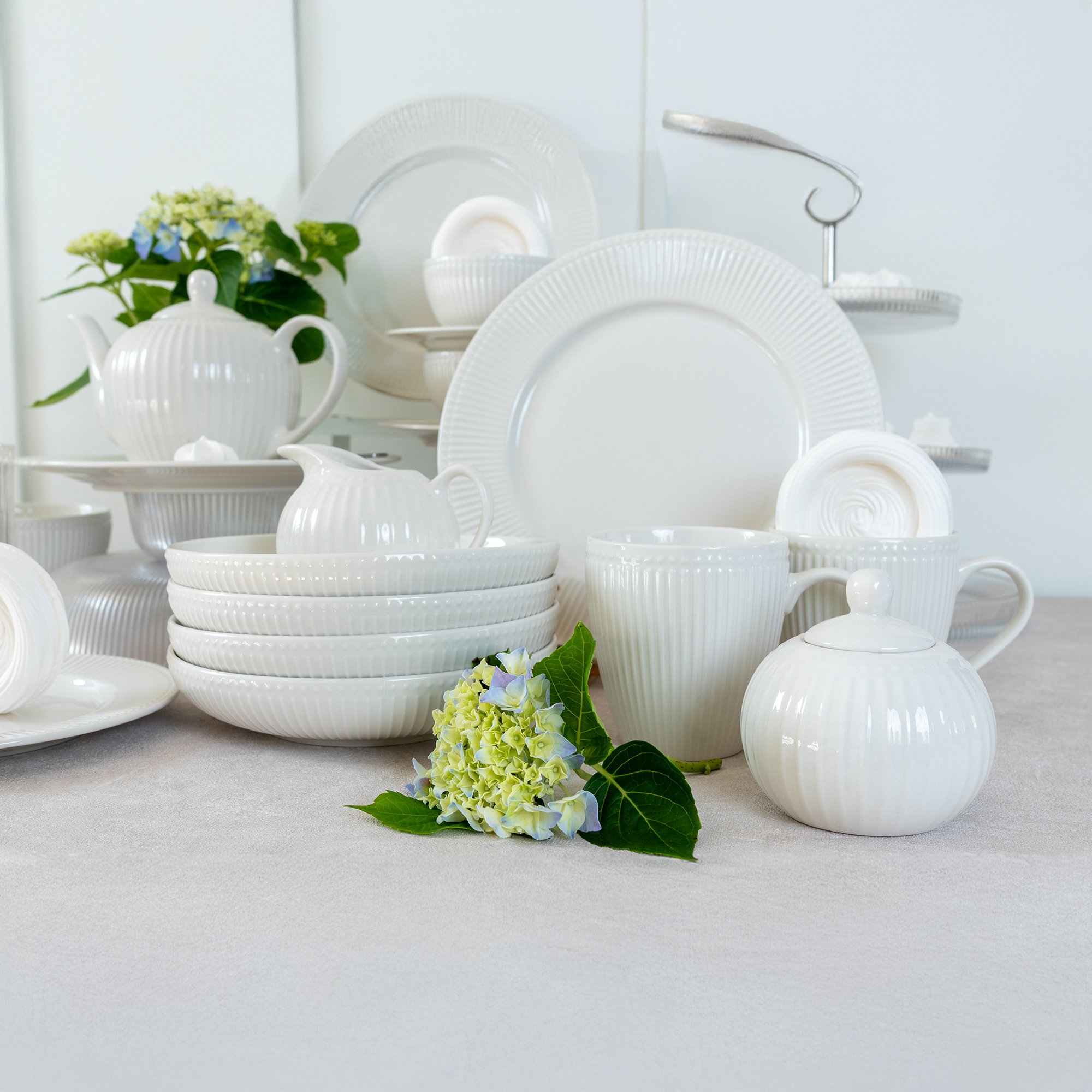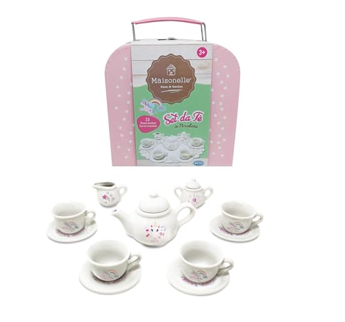 ODS -44022 Keramisk teset 13 stycken, 4 fat, 4 koppar, sockerskål, mjölkhållare och tekanna med lock. Fantastisk resekorg, 44022