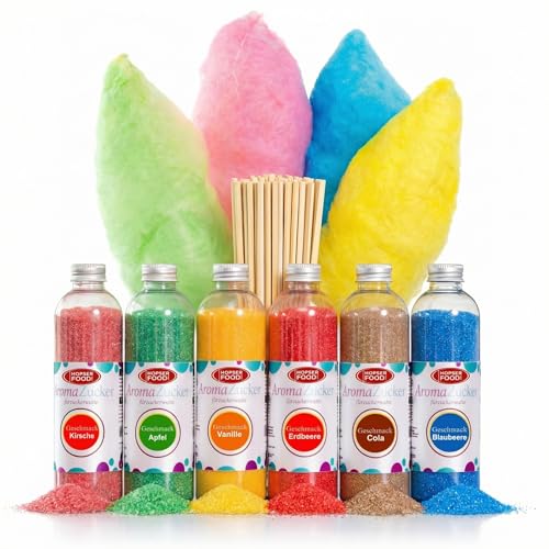 Greendoso-Socker Till Sockervadd 5X160 Gr (Naturliga aromer och färger) Jordgubb-Cola-Äpple-Marshmallow-Vanilj för Sockervaddsmaskin + 20 Sockervaddspinnar på 28 cm (gratis)