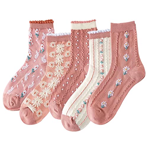 DXYAKY 5 Pairs Womens Floral Cotton Socks Vintage Patterned Crew Socks Novelty Ankle Ruffled Warm Casual Dress Socks (5 Pairs - Pink)