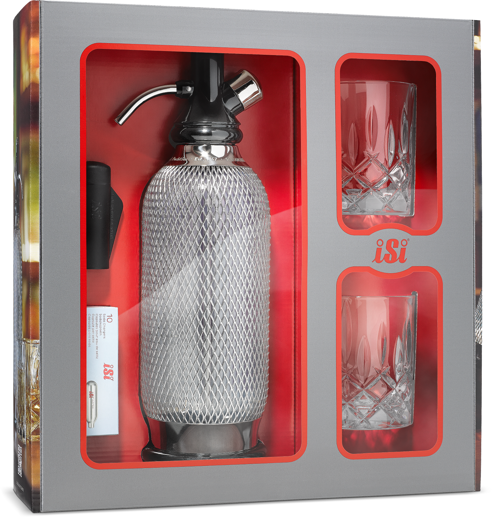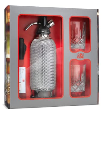 iSi Soda Maker Classic presentset, innehåller 2 x glas och 10 sodakapslar, sodasifon, vattenbubblor 1,0 l, rostfritt stål, bartillbehör för bubblande bubbelvatten