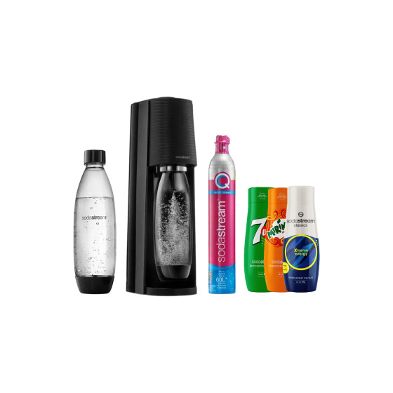 Kolsyrat vatten-beredare SodaStream Terra Black + 2 flaskor + sirap set (7Up x Mirinda x Energy)