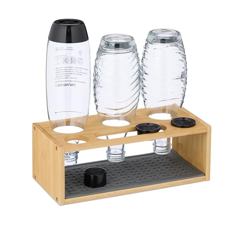 Relaxdays Flaskhållare kompatibel med sodastream-flaskor, bambu, med droppskål, 3 flaskställ, natur