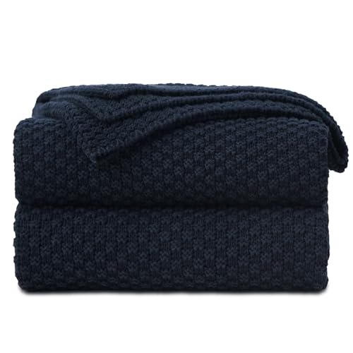 Longhui sängkläder mörk marinblå stickad filt för soffan, mjuk, mysig maskintvättbar 100% bomull soffa stickade filtar, tung 1,4 kg vikt, 130 x 150 cm, mörk marinblå färg.