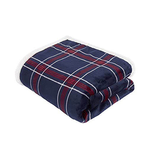 Sleepdown Lyxigt rutigt tryckt flanell fleece marinblå överkast över soffa supermjuk varm mysig sängfilt överkast med sherpa omvänd – 150 cm x 200 cm