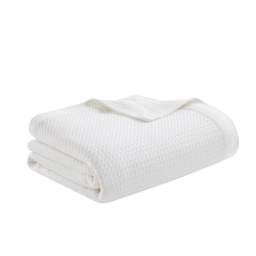 Madison Park Mjuk certifierad 100% egyptisk bomull andningsbar mysig filt, premium våffelstickad klassisk design, lyxigt lätt skydd för hela säsongen för säng, soffa och soffa, elfenben tvilling (168