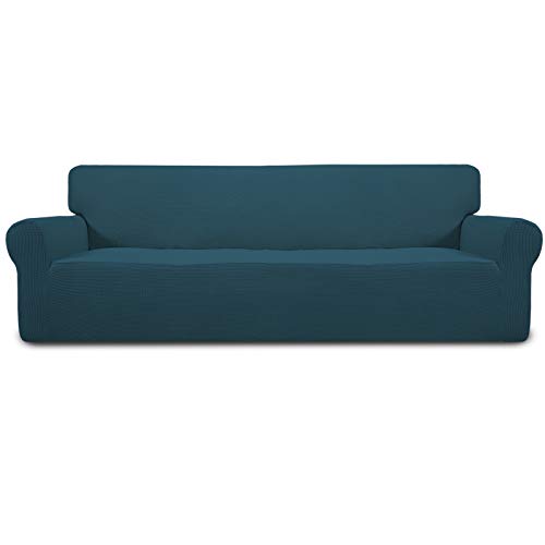 Lättgående stretch 4-sits sofföverdrag 1-del sofföverdrag möbelskydd soffa mjuk med elastisk botten för barn, polyester spandex jacquardtyg små rutor djup blågrön