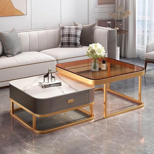 Guld uppsättning av 2 fyrkantiga soffbord i glas med metallram – modern design för vardagsrum, kontor, sovrum – enkel montering förvaring soffbord