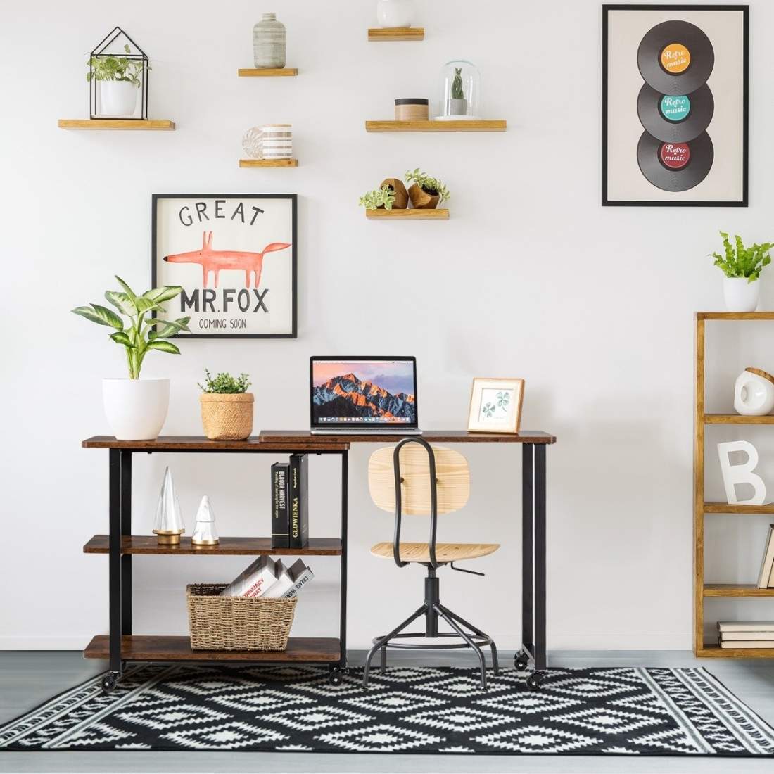 L-format sidobord med hjul & 2 hyllplan 360° roterande soffbord Rustikbrun