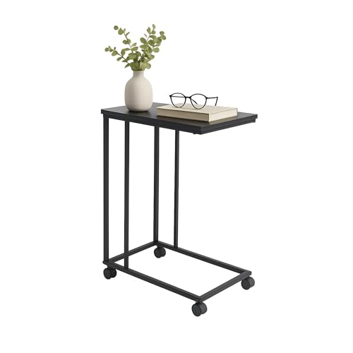 WOLTU Soffbord, bord med 2 hyllor och 1 sidoficka, C-format vardagsrumsbord, på hjul, för bäddsoffa, trä, spånskiva och metall, 50 x 35 x 62 cm, svart BTS04sz