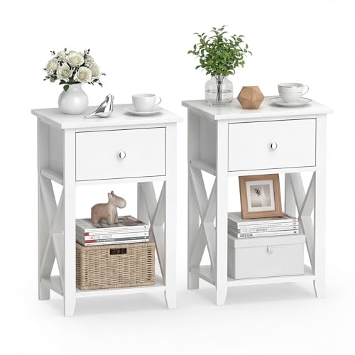 COSTWAY X-format sidobord set om 2, modernt nattduksbord med låda och nedre förvaringsfack, mångsidigt soffbord, sidobord för vardagsrum, sovrum, hall, enkel montering (2, vit)