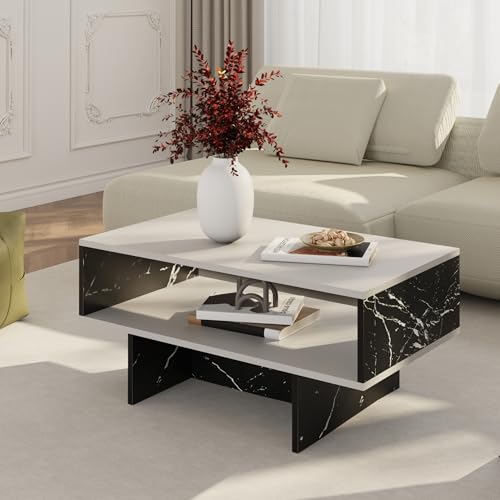 Yclty Soffbord rektangulärt exklusivt soffbord, härdat glas marmor bordsskiva textur med matt svart metallram moderna mittbord för vardagsrum