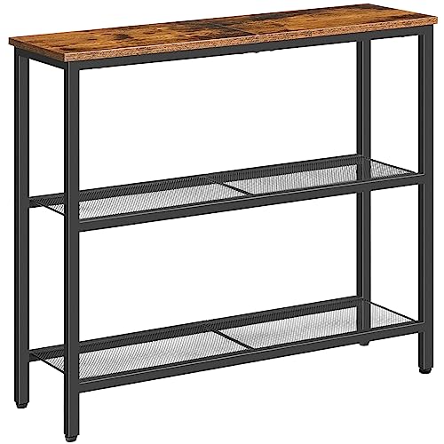 HOOBRO Smalt konsolbord med förvaringshyllor, 3 nivåer smalt entrébord för vardagsrum, industriellt soffbord för hall, konsolbord ingång för sovrum, rustikt brunt och svart EBF73XG01