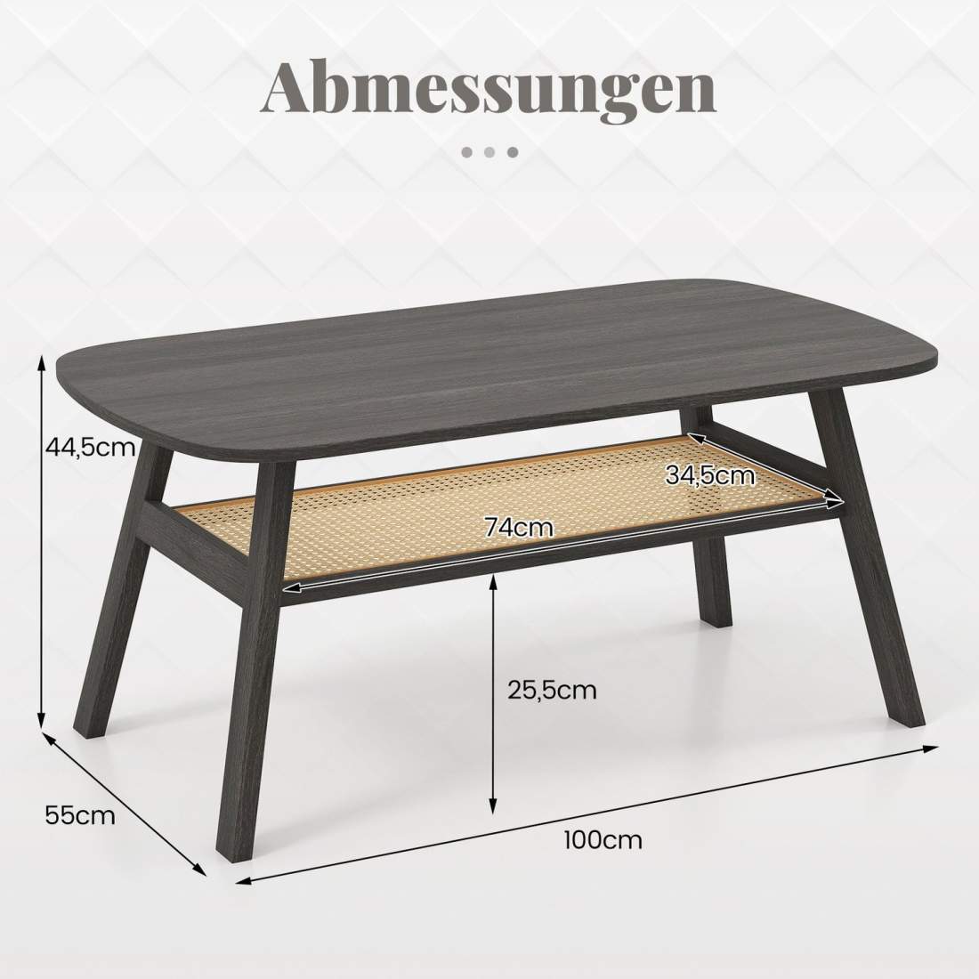 Rustikt soffbord i trä med rottinghylla – 2 nivåer, 100x55x44,5 cm