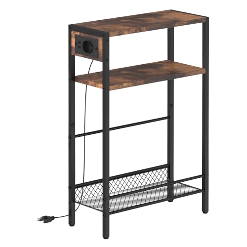 HOOBRO Smalt soffbord med uttag, 3 nivåer nattduksbord, 1 standarduttag och 2 USB-portar, för små utrymmen, upphöjda kanter, vintagestil, för vardagsrum, sovrum, vintage brun EBF102CBZ01