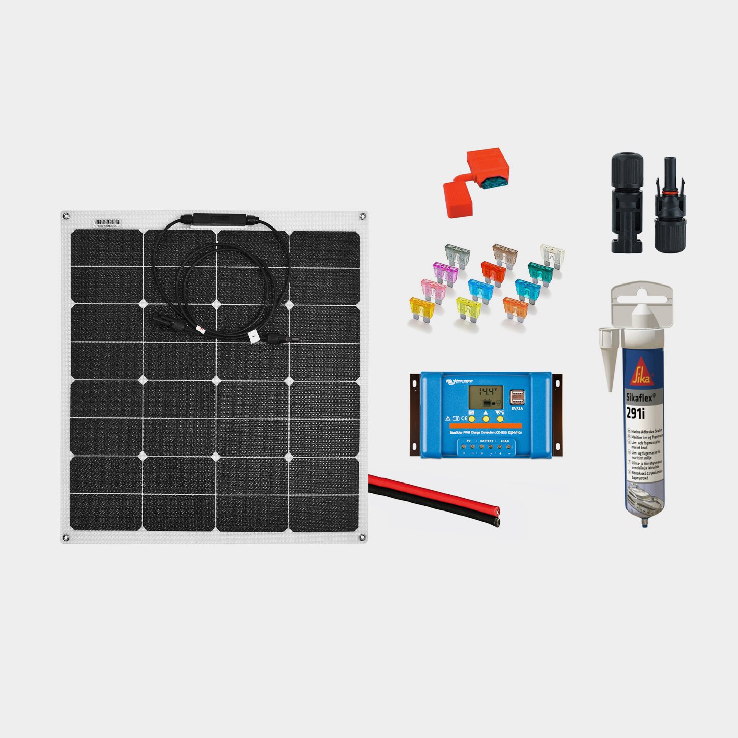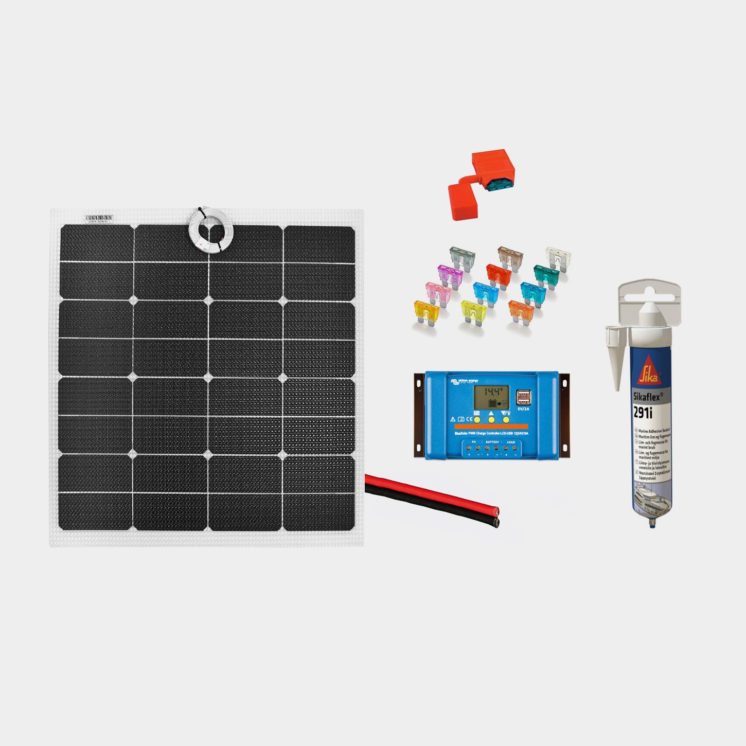 Juni Solar Solcellspaket för fast installation Flush Mounted Cable, 60 W, monokristallin, flexibel, 12 V, 580 x 540 3 mm, med PWM-regulator (10 amp) + kablar säkringshållare & säkring lim