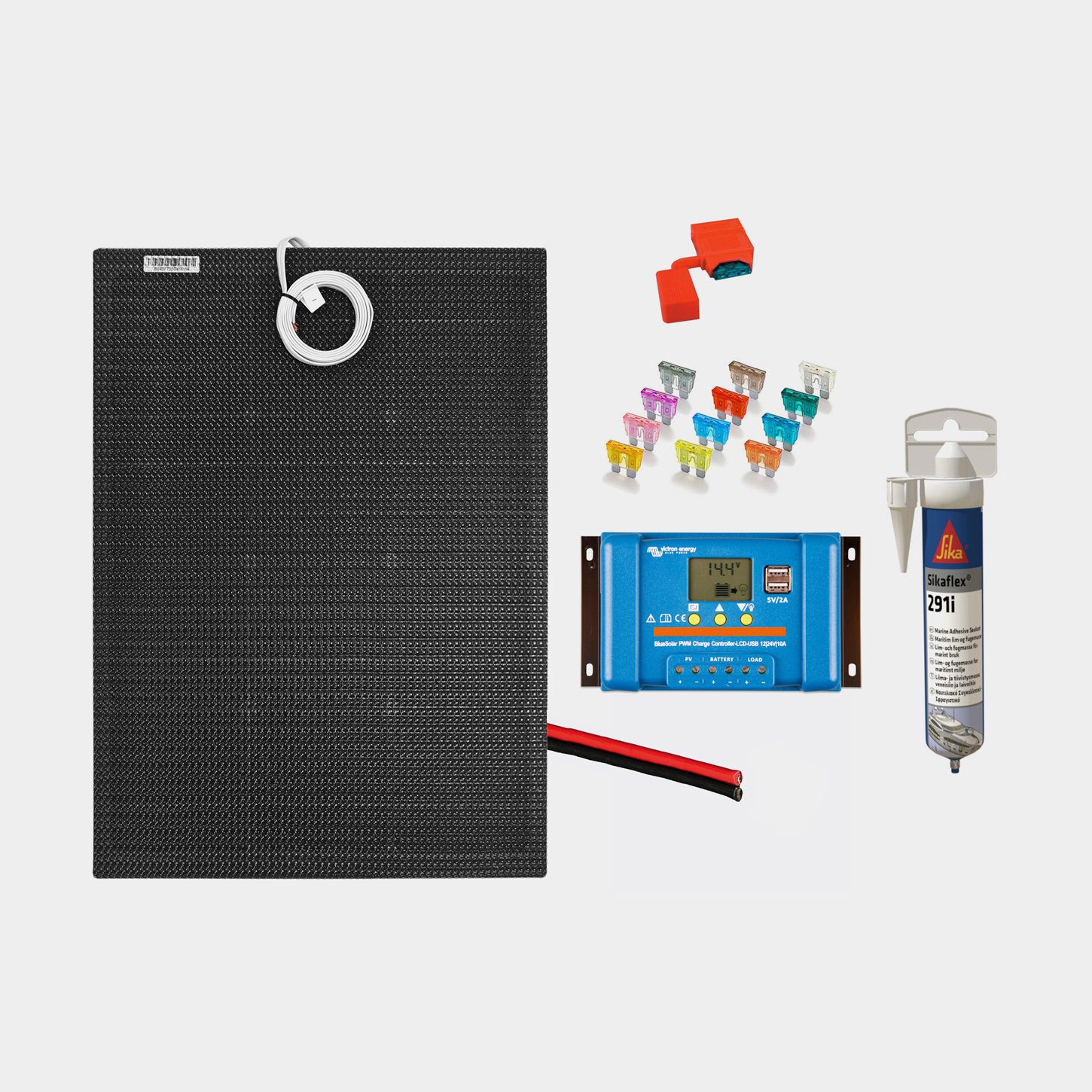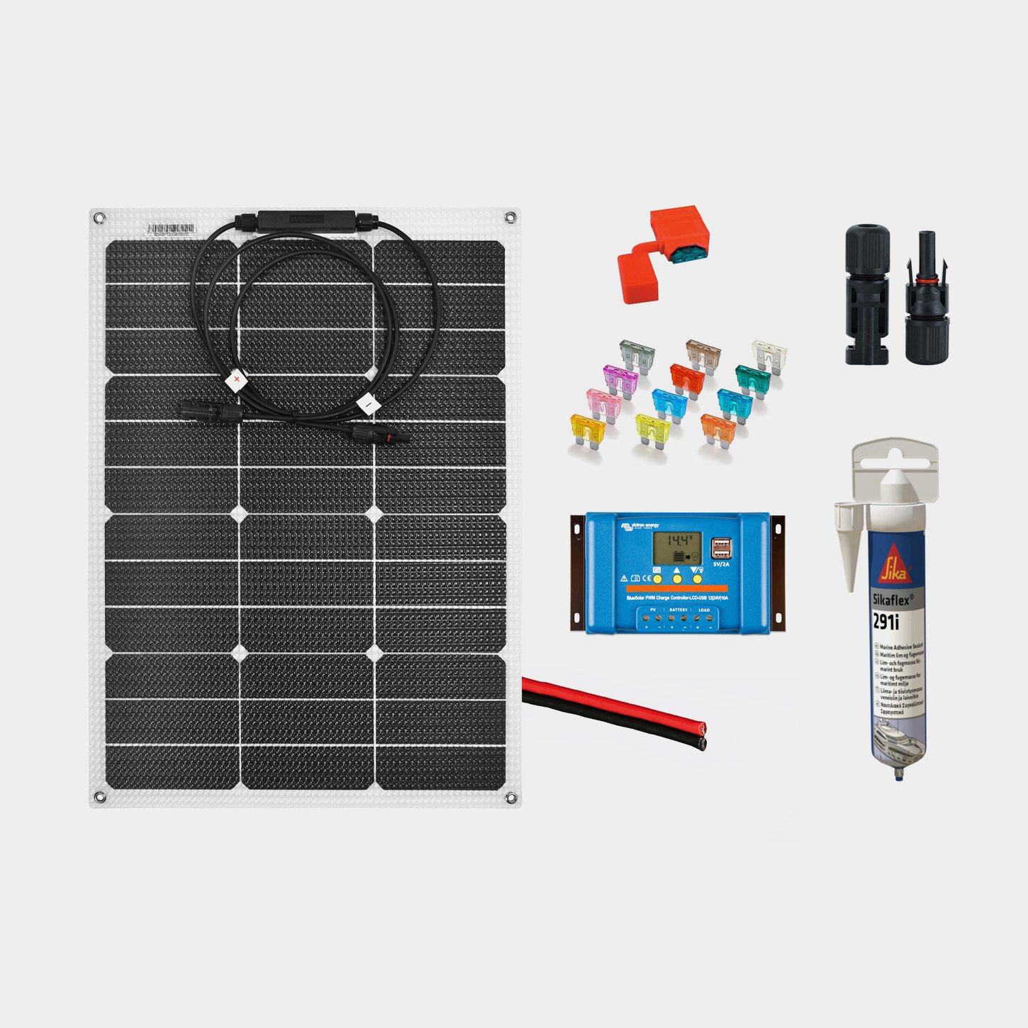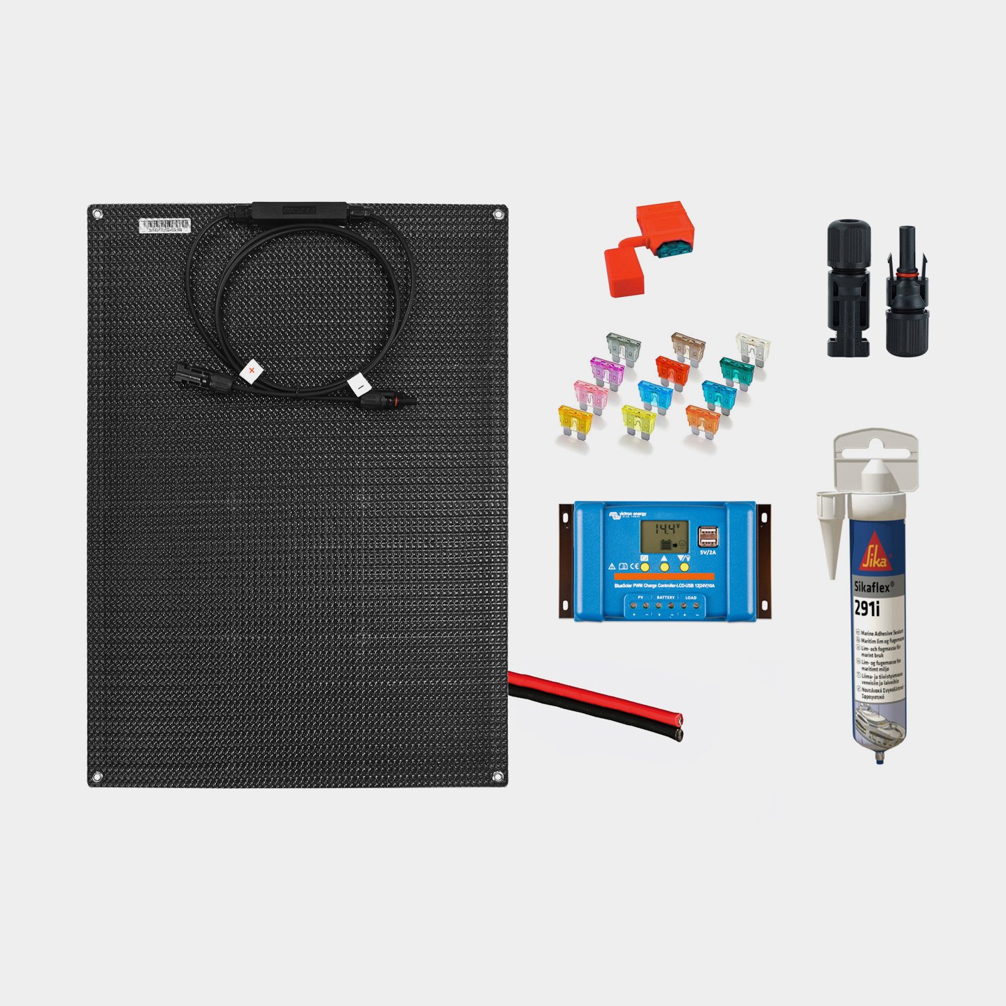 Juni Solar Solcellspaket för fast installation Flush Mounted Cable, 100 W, monokristallin, flexibel, 12 V, 1040 x 520 3 mm, med PWM-regulator (10 amp) + kablar säkringshållare & säkring lim