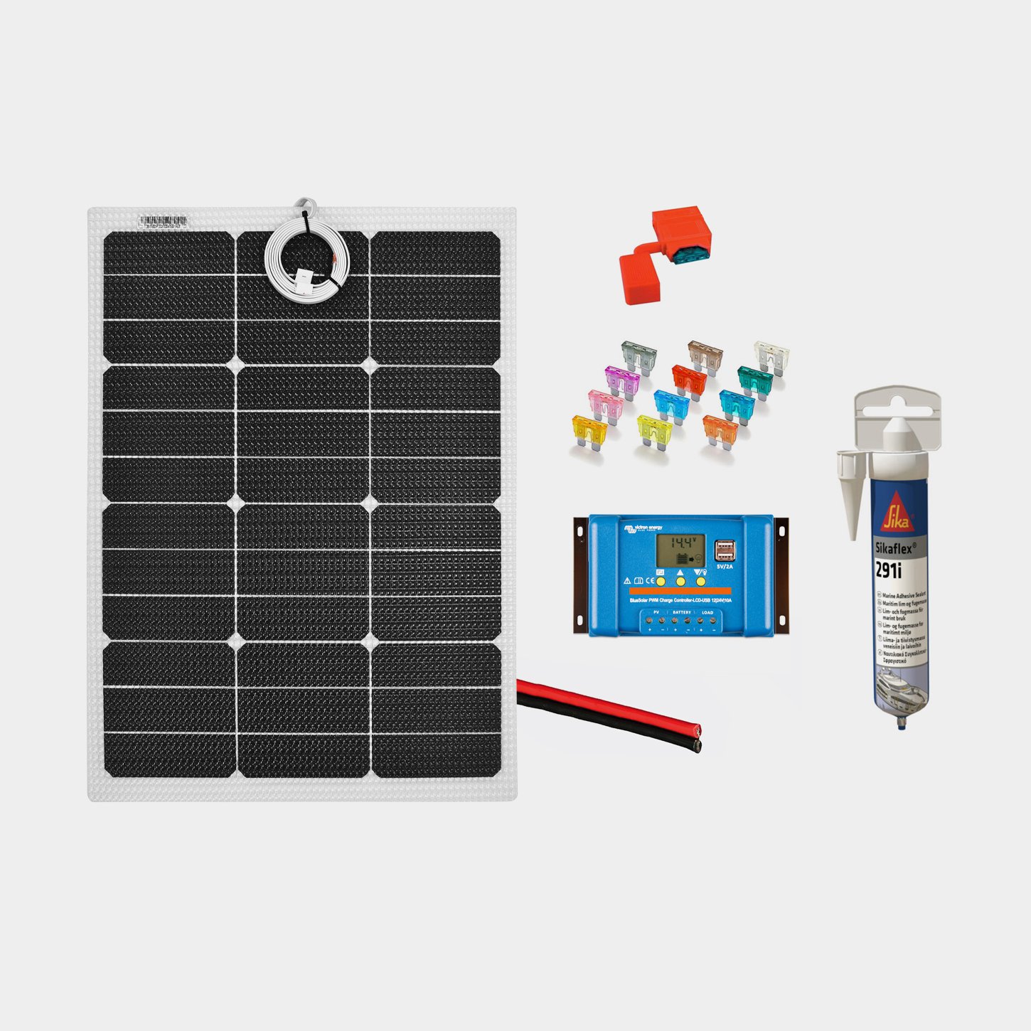 Juni Solar Solcellspaket för fast installation Flush Mounted Cable, 40 W, monokristallin, flexibel, 12 V, 570 x 410 3 mm, med PWM-regulator (5 amp) + kablar säkringshållare & säkring lim