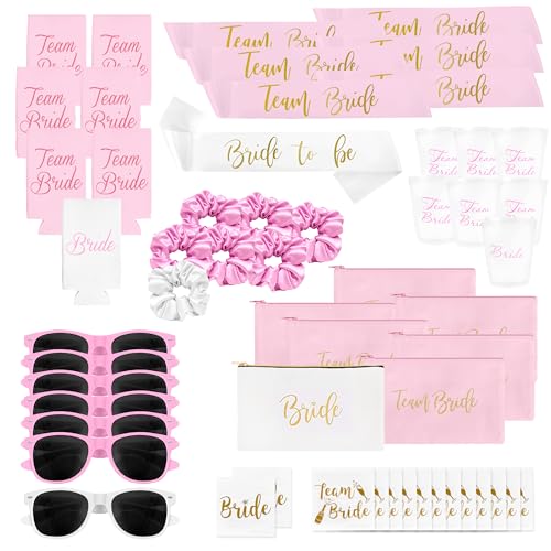 Chug Buddy möhippa tillbehör och tillbehör – 56 delar rosa möhippa presenter paket med möhippa band, solglasögon, koppar och mer – brudtillbehör för möhippa