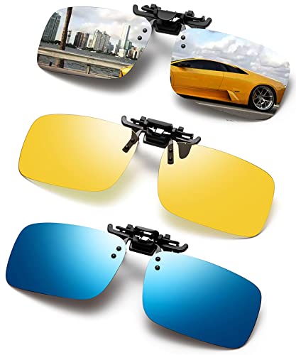 Flip-up Clip-on solglasögon anti-bländning UV-skydd rektangulära solglasögon för män kvinnor, Blå & silver & nattgul, X-Large