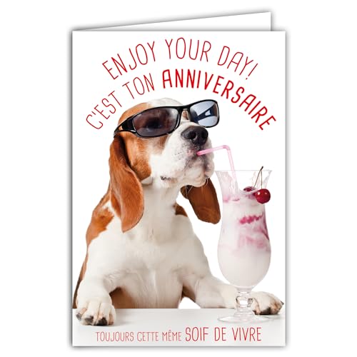 AFIE Humoristisk grattis på födelsedagen kort med illustrerat kuvert format 17,5 x 12 cm rolig hund rigorolo med solglasögon och glass körsbär - fransk tillverkning skapelse 69-6208