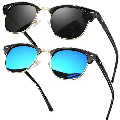 KANASTAL 2 Par Solglasögon Polariserade Herr Blå Halvbåge Mörka Sol Glasögon Dam Klassiskt Browline 2 Pack Blue Sunglasses Polarized Women Men Half Rim for Vandring Körning Fiske - Svart och Blå