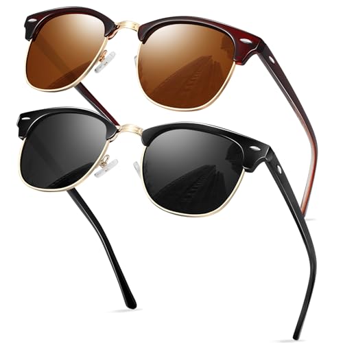KANASTAL Polariserade Solglasögon Herr Halvbåge Klassiskt Metall Browline Polarized Sunglasses for Men Svart Sol Glasögon Dam Classic Women Sunglasses for Vandring Körning Fiske 2 Par - Svart och Brun