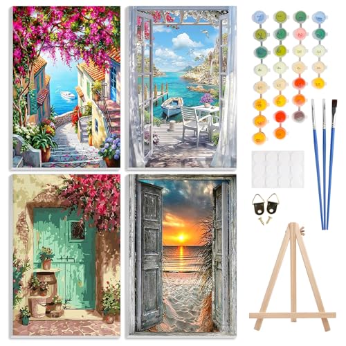 4-pack måla efter nummer kit för vuxna med inramad duk och trästaffli, gör-det-själv vuxen målning efter nummer kit olja akryl, blomdörr solnedgång målningskit för nybörjare, konst och hantverk för