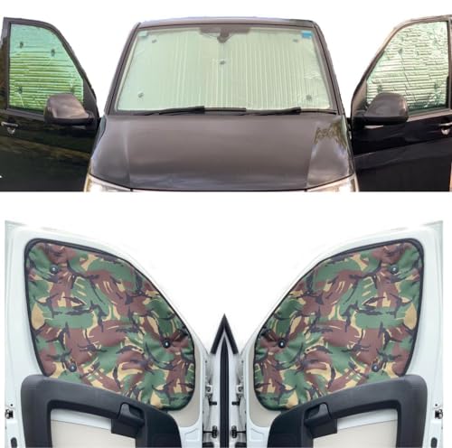 Solskydd för bil vindruta solskydd inomhus kompatibel med Peugeot Partner (2007–2018) (komplett set + öppningsbar baklucka takfönster) kamouflagebaksida, vändbar och termisk