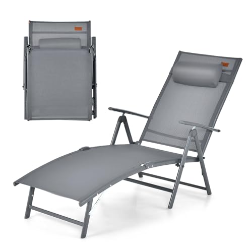 GOPLUS Solstol, hopfällbar solstol, trädgårdsstol, väderbeständig, ryggstöd justerbar i 7 positioner, relaxstol, trädgård med nackstöd, kan belastas upp till 150 kg, strandstol, trädgård, balkong,