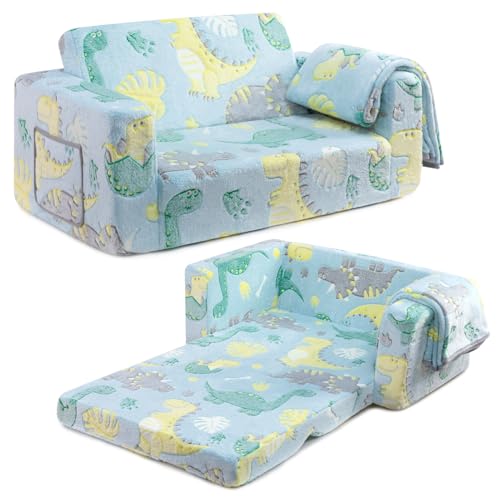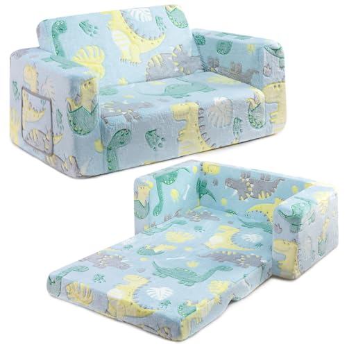 BEJOY Bäddsoffa för barn, extra bred 2-i-1 småbarn mjuk sherpa soffa hopvikbar, konvertibel barnsäng till solstol för flickor och pojkar, lysande dinosaurie