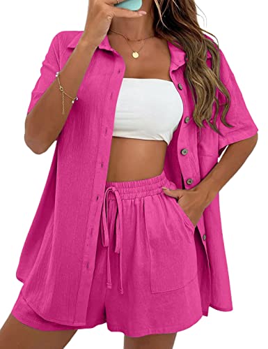APAFES Dam sommar bomull linne shorts set 2 delar shorts topp lounge strand semester tvådelad kläder träningsoveraller, Rosröd, XL