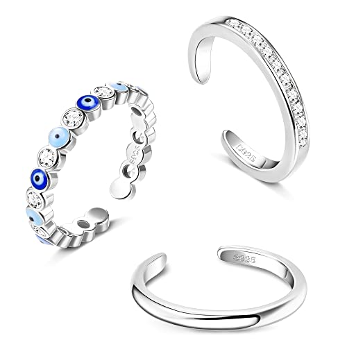 Sllaiss Evil Eye Tåringar för Kvinnor 3 st 925 Sterling Silver Tå Ringar Set Cubic Zirconia Toe Ringar Justerbara Öppen Tå Ringar Sommar Fot Smycken Silver