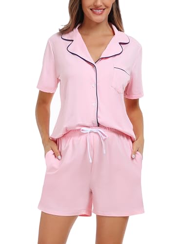 Lovasy Pyjamas Dam Sommar Bomull Knappar Framåt Pyjamas Set Kort V-ringning och Kort Ärm 2 Stycken Hemmapyjamas Lättviktig T-shirt Pyjamas, Ljusrosa, L